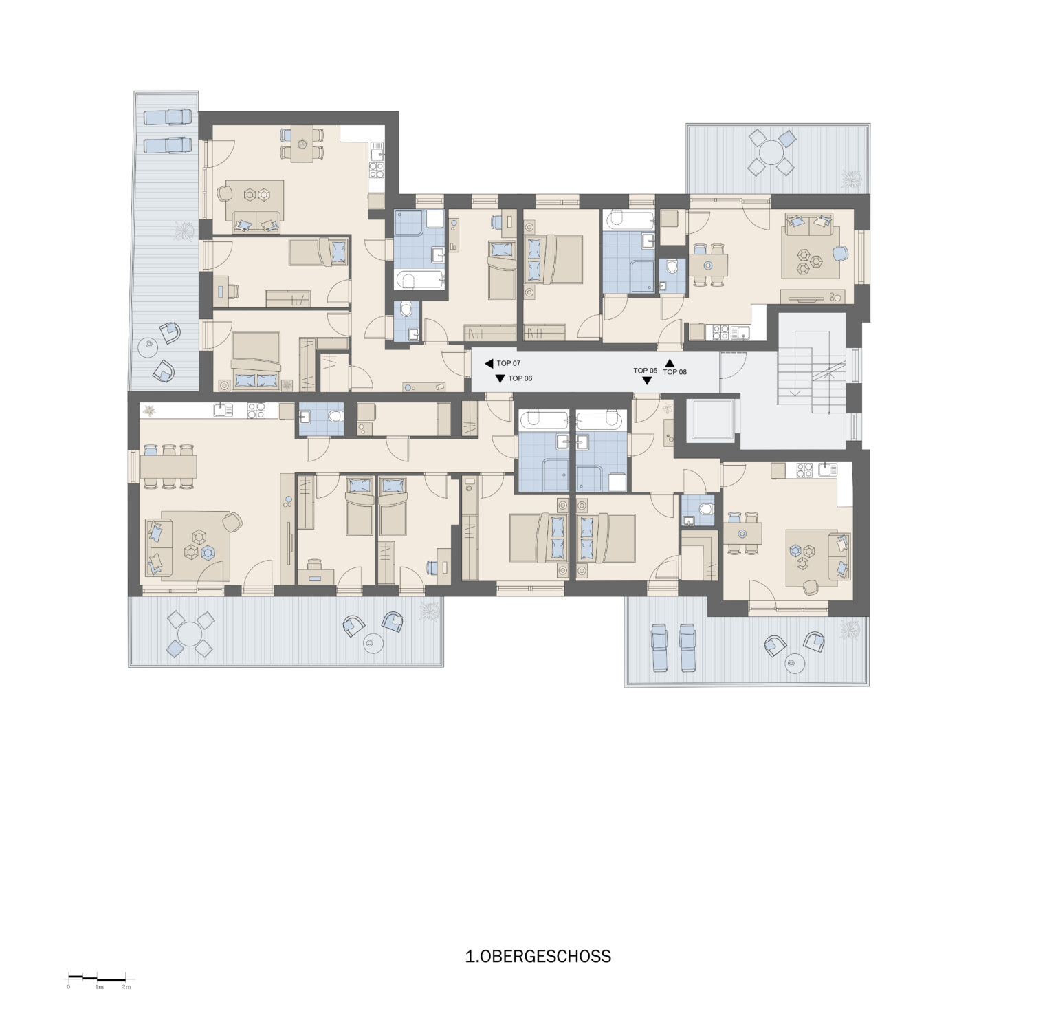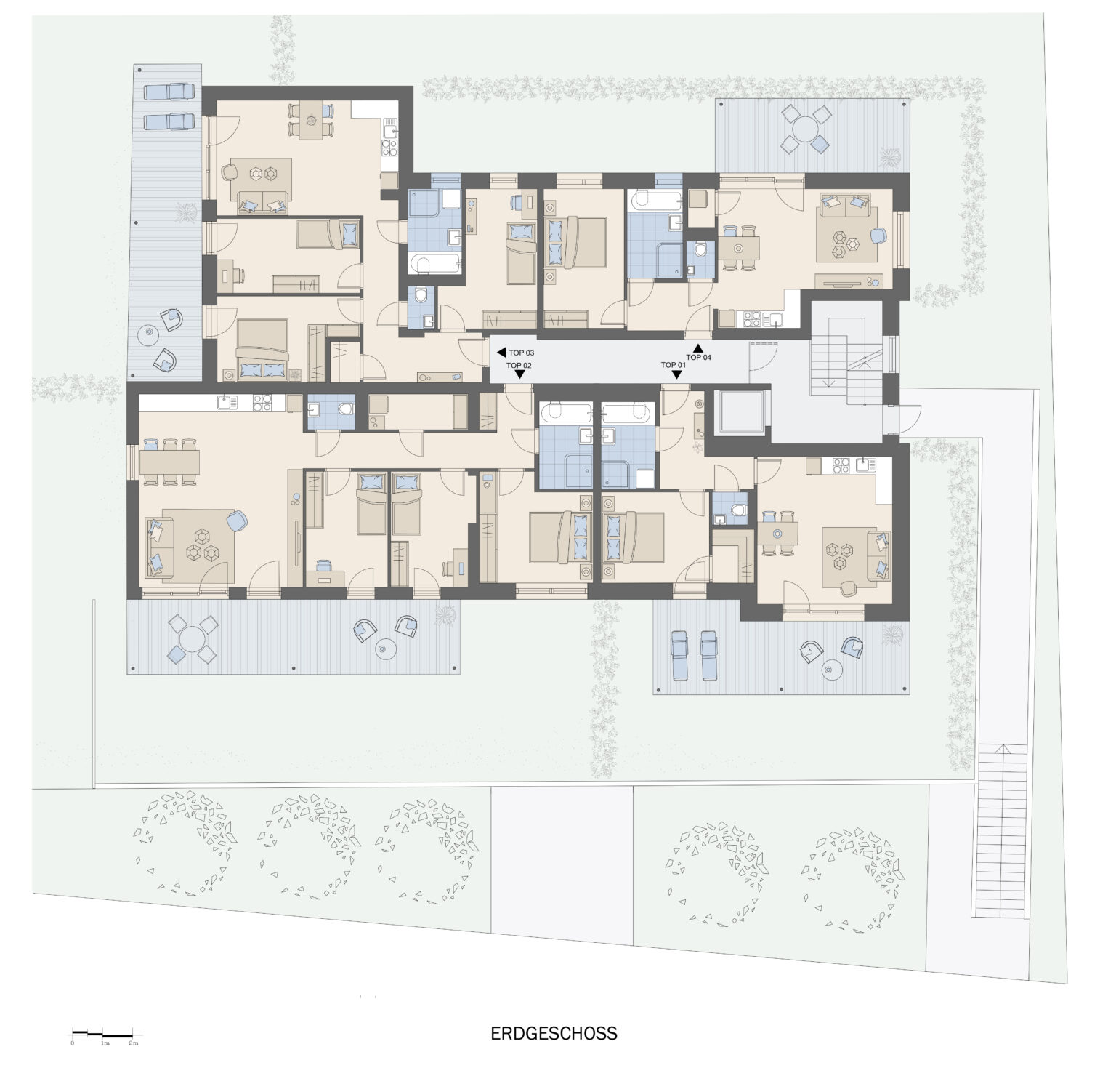 - Freiflächen, Eigengärten mit Terrasse im Erdgeschoß, großzügige Terrassen im 1. und 2. OG